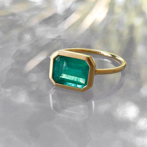 All eyes on Elise. A captivating green emerald, ethically sourced from Brazil. Set on an 18k gold band with a soft brushed matte finish, this Fade to Black design lets the emerald shine in full color. Bold, vibrant, and effortlessly refined.
